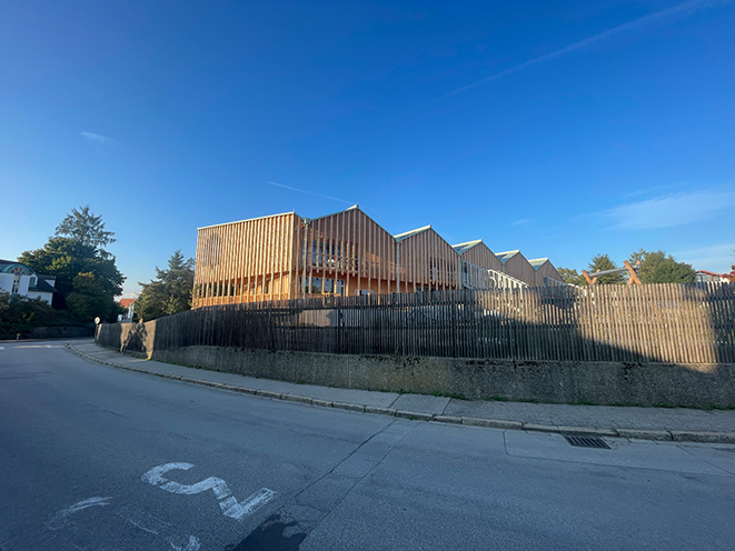 Oktober 2023 Neues von der Baustelle Wendelstein Werkstätten in Rosenheim: Die Holzfassade nimmt Gestalt an, der Innennausbau läuft auf Hochtouren und endlich werden die Außentreppen montiert. Foto studio lot