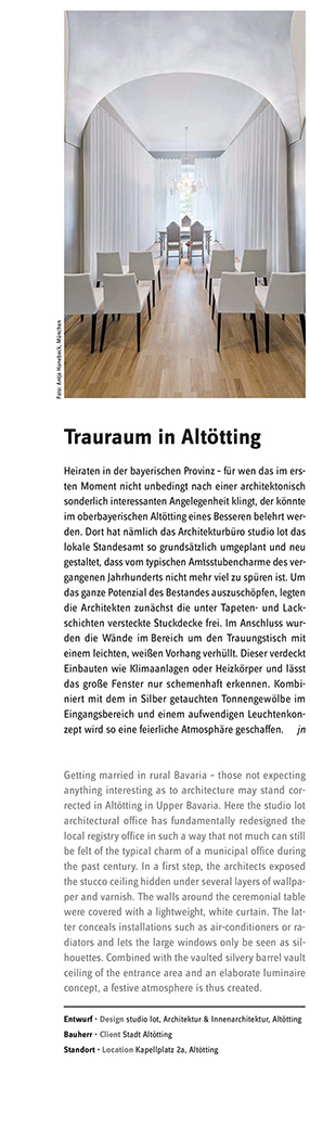 In der Novemberausgabe 2019 der renommierten Fachzeitschrift AIT ist ein Artikel über den von studio lot neu gestalteten Trauungsraum des Altöttinger Rathauses erschienen.