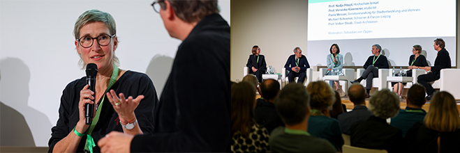 Veronika Kammerer nimmt als Speakerin an einer Diskussionsrunde teil anlässlich des alle vier Jahre organisierten Deutschen Architekt*innentag im Berliner bcc zum Thema "Umbauen - Potenziale des Bestands".