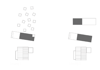 2-geschossige, kantige Würfel mit großen Fensteröffnungen und Fassaden