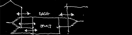etc.) in der Erde verschwinden. Dadurch kann die Turnhalle im Erdgeschoss freigespielt und durch großflächige Verglasung von Außen einsehbar gemacht werden. Sport wird so zu einem Begegnungsort, und es ergeben sich interessante Blickbezüge in die tiefer gelegte Turnhalle.